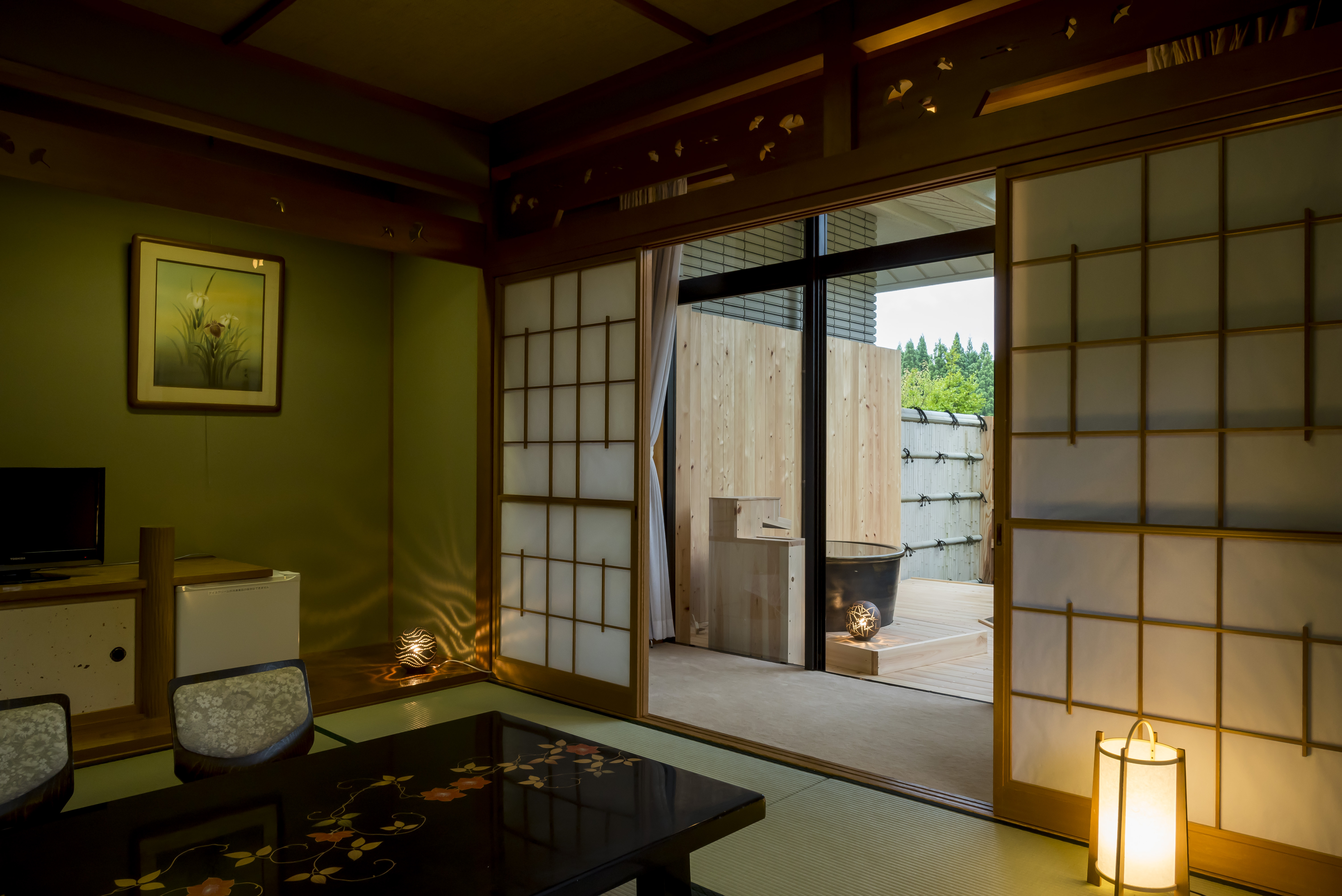 静かな里山の景色を眺め、夜には星空を仰ぐ、露天風呂付客室。当宿で最も人気のお部屋です。