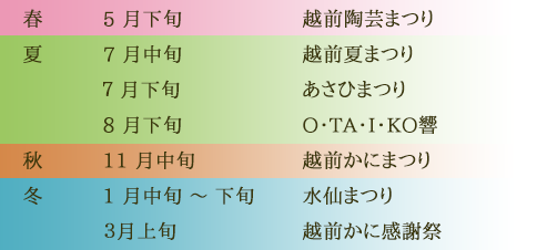 劔神社(つるぎじんじゃ)は、1800年の歴史を有し、毎年多くの初詣客でにぎわう神社をしても知られています。戦国武将織田信長の祖先は、当社の神官で、出身地の地名を取って「織田氏」を名乗ったとされます。本殿は県の指定文化財に、梵鐘は国宝に、また秋に奉納される太鼓「明神ばやし」は、県の無形民俗文化財にそれぞれ指定されています。住所:越前町織田113—1TEL:0778-36-0404